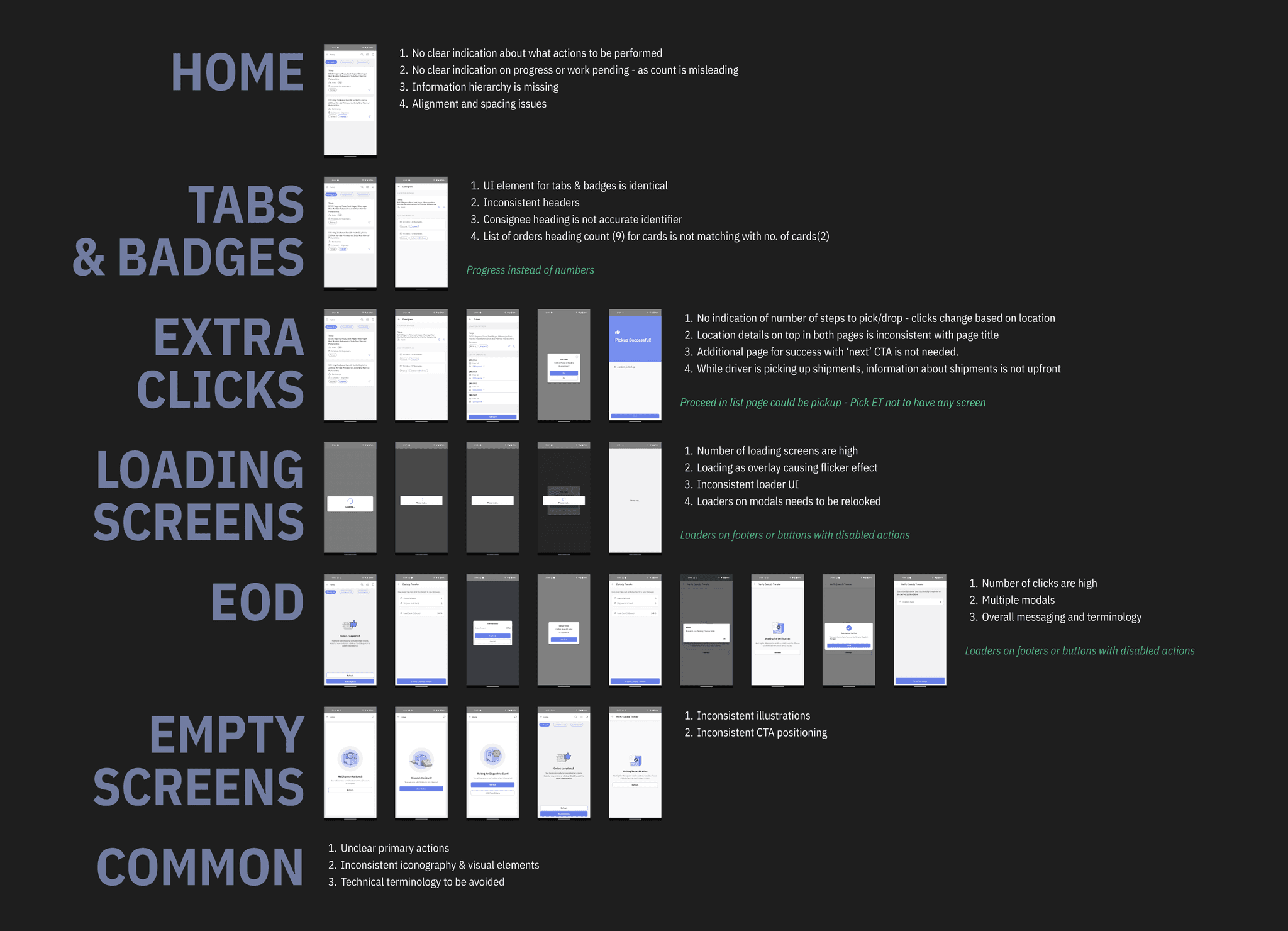 I did a hands-on evaluation of the existing OS1 driver app by assigning dispatches to myself and completing tasks like a delivery rider — like any other day, but took screenshots and documented insights this time. This helped uncover key usability and performance issues—delays in loading, inconsistent UI, and unclear task flows that made basic actions unnecessarily complex.