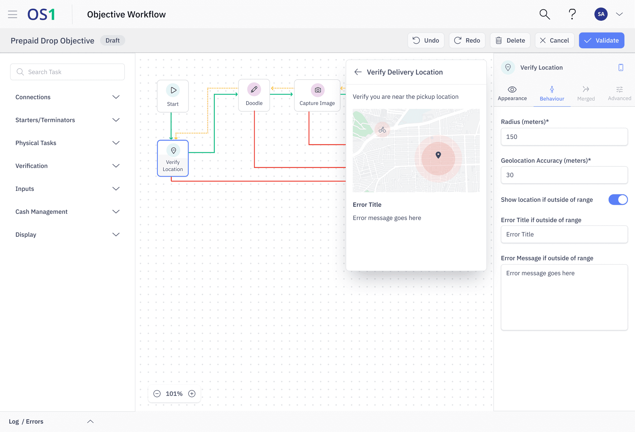 OS1 Workflow Builder is a canvas for configuring workflows for mobile apps used by drivers.